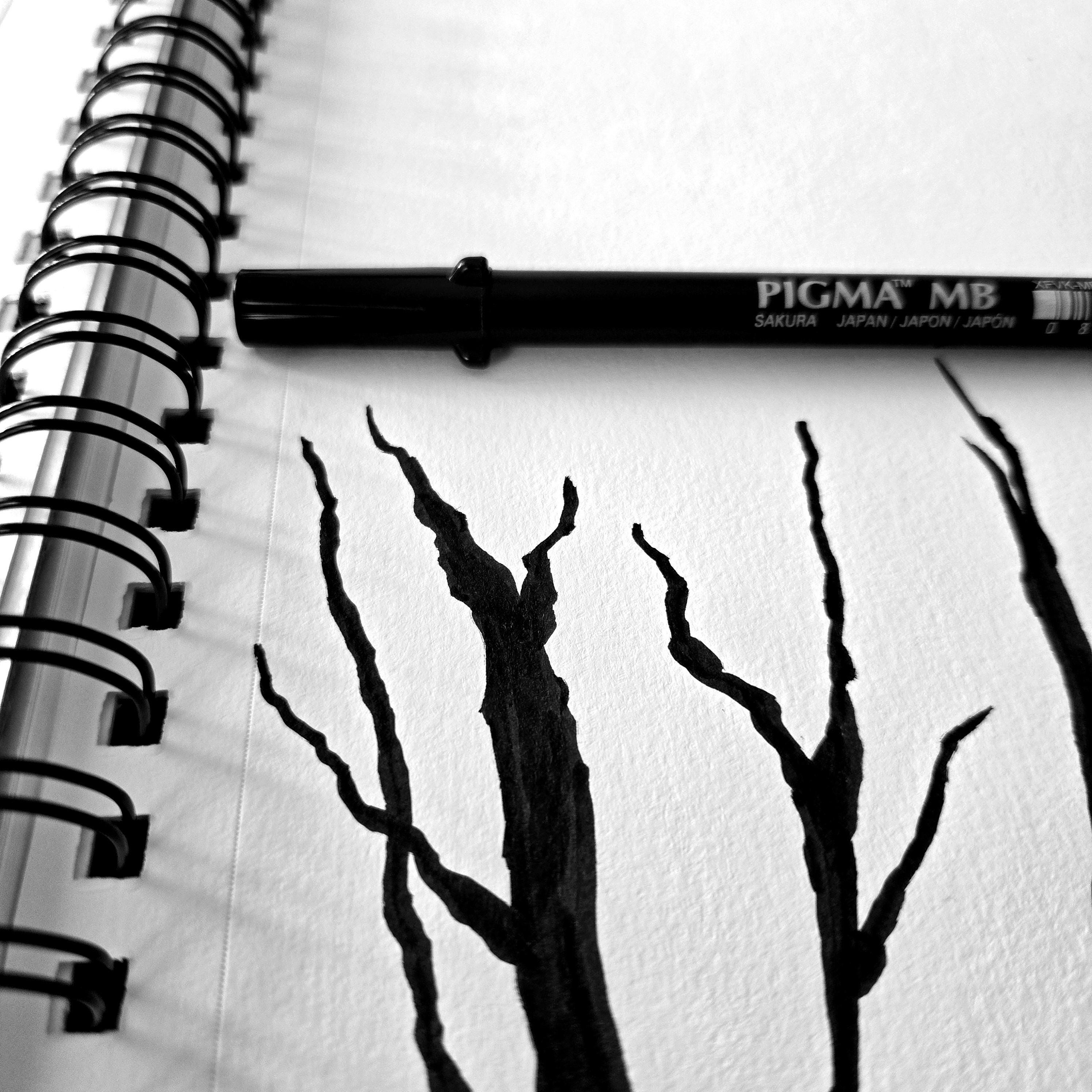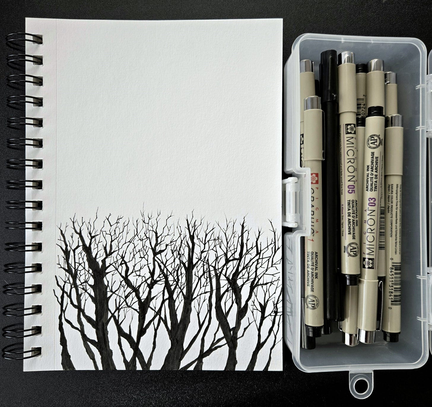 To begin, I broke out my Sakura Pigma Micron pens. They’re archival, so I knew they can stand the watercolor (but it’s also my go-to standard for drawing, if I’m being honest). Thus far, I’ve mostly finished the trees and branches, which is all I intended to do before finally moving onto the painting process.